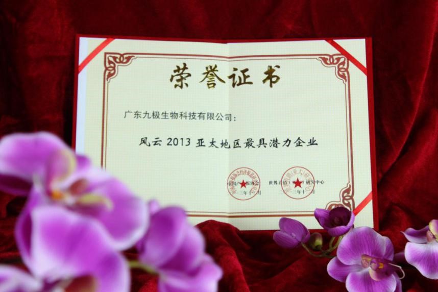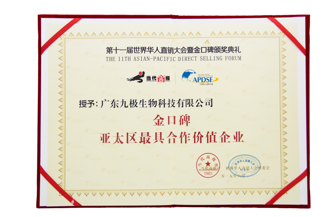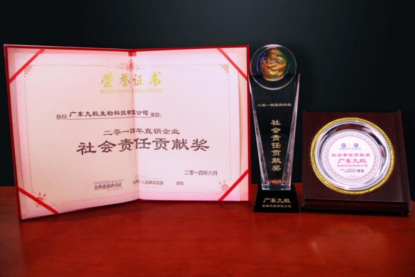 近年來,九極產(chǎn)品獲得了廣大消費(fèi)者厚愛和好評,獲得風(fēng)云2013亞太地區(qū)最具潛力企業(yè)獎(jiǎng)、2014直銷企業(yè)社會(huì)責(zé)任貢獻(xiàn)獎(jiǎng)、金口碑亞太區(qū)最具合作價(jià)值企業(yè)獎(jiǎng)等眾多殊榮,也被認(rèn)定為“廣州市高新技術(shù)企業(yè)”。